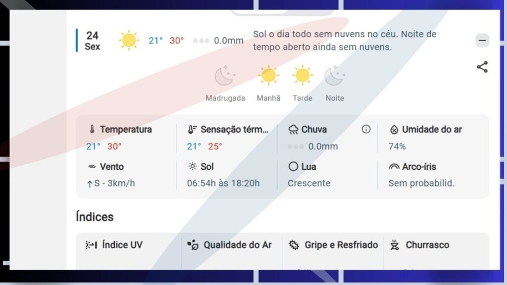 - Condições: Sol com algumas nuvens durante o dia. À noite, o céu permanece com poucas nuvens.