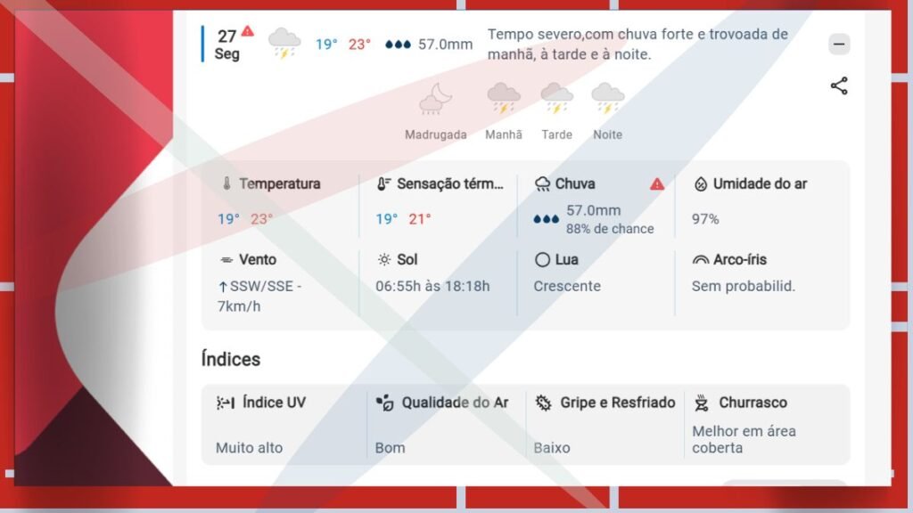 - Condição: Tempo nublado com chuva e trovoadas durante todo o dia e à noite.
