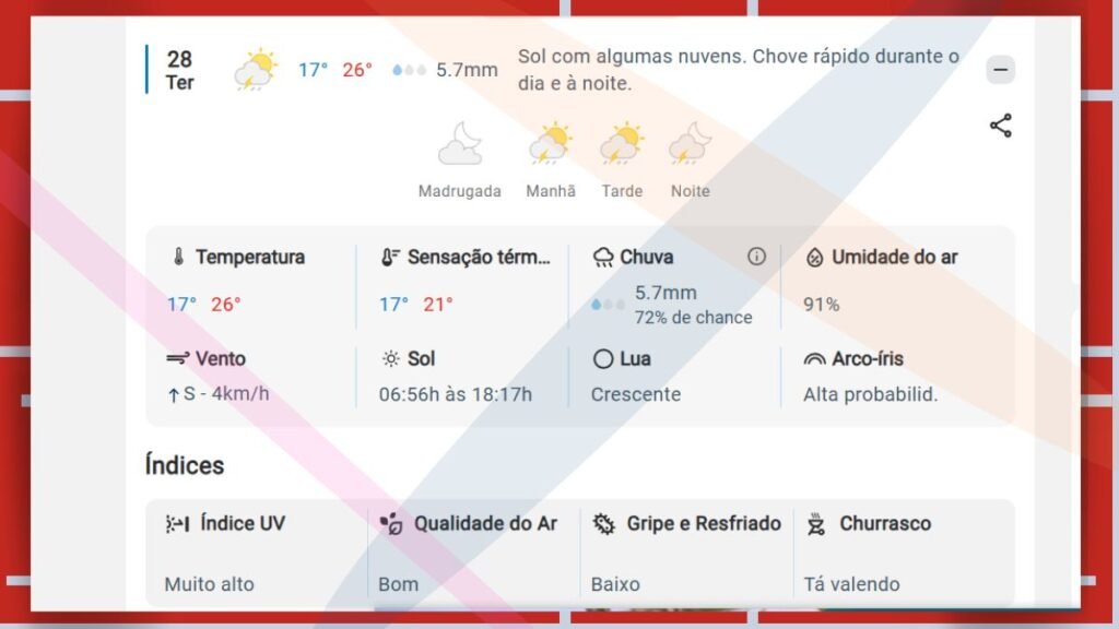 • Destaque: Há uma alta probabilidade de formação de arco-íris para o dia de amanhã.